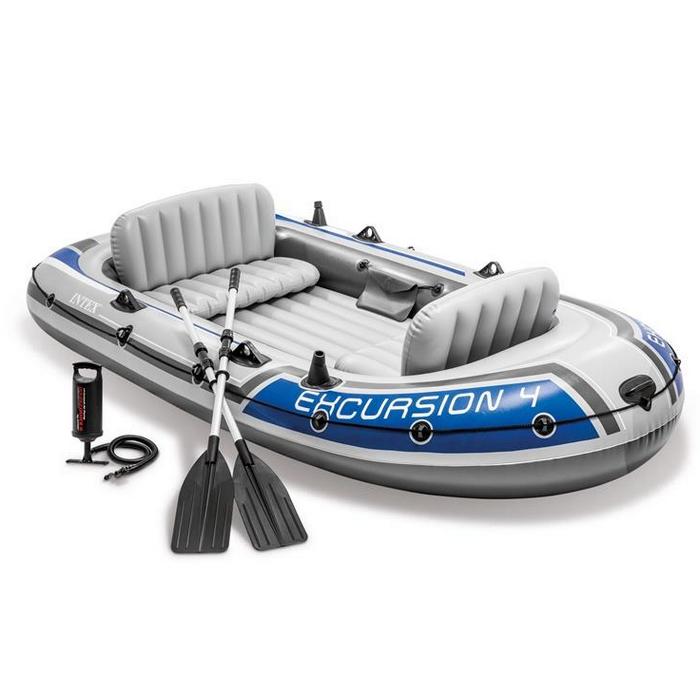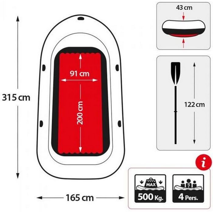 Komplektā: 2 alumīnija 137 cm gari airi, pumpis, 2 piepūšami sēdekļu spilveni ar balstiem, rokturiem un virves satvērienu, airu turētāji, 2 makšķeres turētāji, motora stiprinājumi.